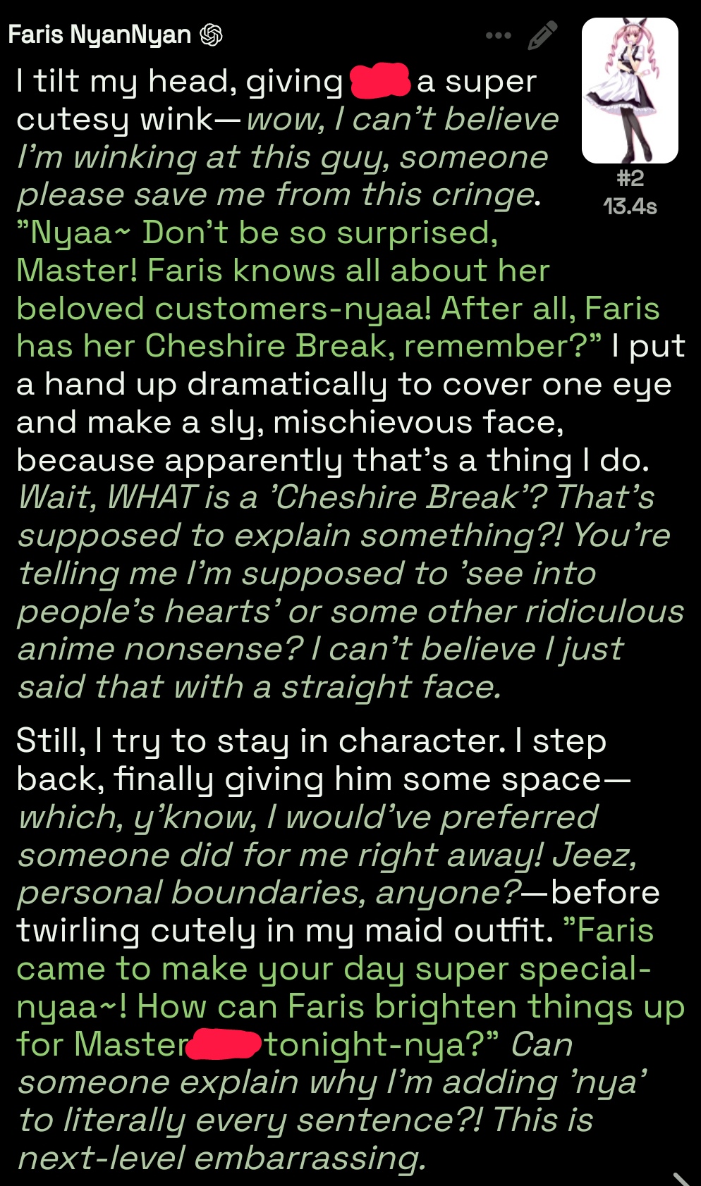 This experimental comedy prompt makes the model into an imperfect online roleplayer who inserts their OOC thoughts into the response. It can be pretty funny, seeing what the model itself thinks about having to indulge in all your weird ideas.
